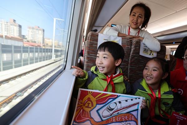 12月7日,師生代表在延安站開(kāi)往西安北站的復(fù)興號(hào)動(dòng)車組列車上觀賞沿途風(fēng)景。當(dāng)日,來(lái)自西安、延安、銅川、渭南四市的西延高鐵沿線居民及中小...