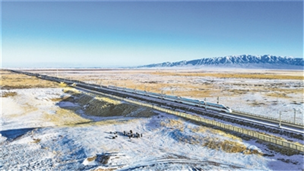科技日報:一列動車組列車行駛在山丹馬軍場境內(nèi)的蘭新高鐵上