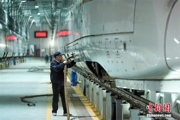 1月16日晚,在北京動(dòng)車段北京北動(dòng)車運(yùn)用所,工作人員在清洗和諧號動(dòng)車組。據(jù)了解,在春運(yùn)高峰時(shí)段,北京北動(dòng)車所每日最高上線檢修44組動(dòng)車組,相比平時(shí)檢修量提高38%。為應(yīng)對春運(yùn)高峰時(shí)段檢修量提升,一線工作人員夜以繼日開展檢修,保障春運(yùn)動(dòng)車組運(yùn)行平穩(wěn)安全。