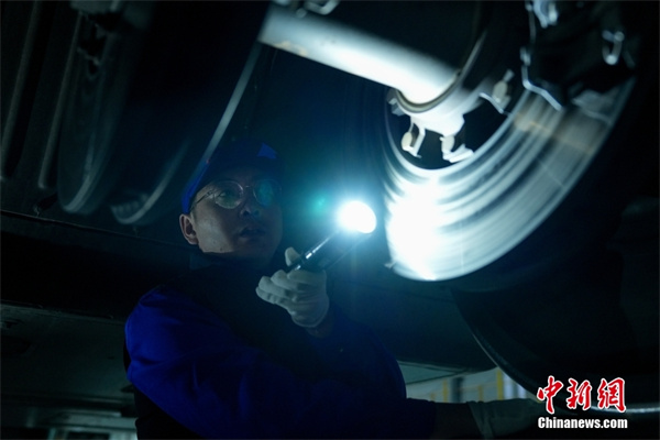 1月16日晚,在北京動(dòng)車段北京北動(dòng)車運(yùn)用所,動(dòng)車組機(jī)械師開展輪對檢查作業(yè)。