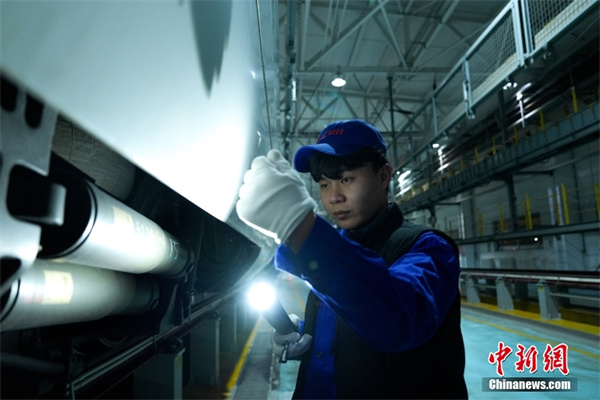 1月16日晚,在北京動(dòng)車段北京北動(dòng)車運(yùn)用所,動(dòng)車組機(jī)械師對動(dòng)車組開展側(cè)身檢查。