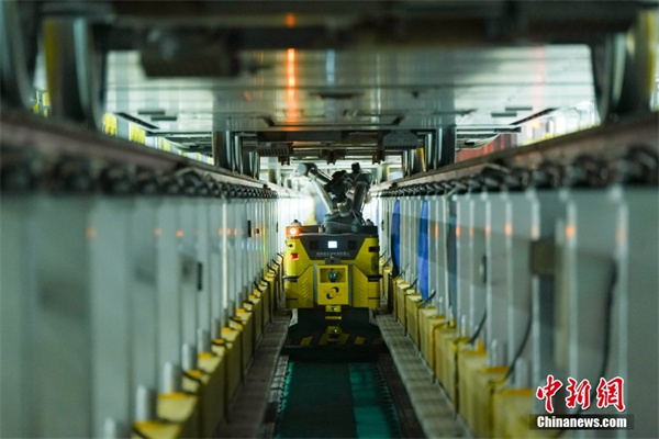 1月16日晚,在北京動(dòng)車段北京北動(dòng)車運(yùn)用所,動(dòng)車組車底檢測機(jī)器人在進(jìn)行檢測作業(yè)。