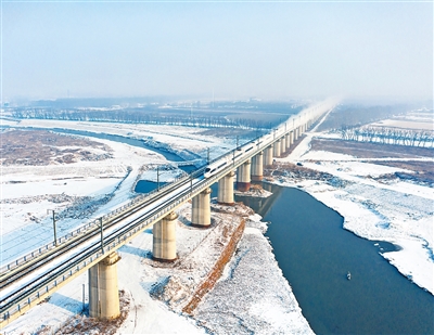 沿著哈大高鐵線,動(dòng)車(chē)組列車(chē)在皚皚白雪中行進(jìn)。趙 旭攝