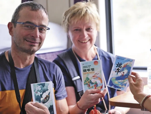 來自德國的夫婦收到乘務(wù)員自制的端午賀卡和香包后興奮地說:“沒想到在火車上還能體驗中國傳統(tǒng)節(jié)日,這次旅行讓我們難忘!”