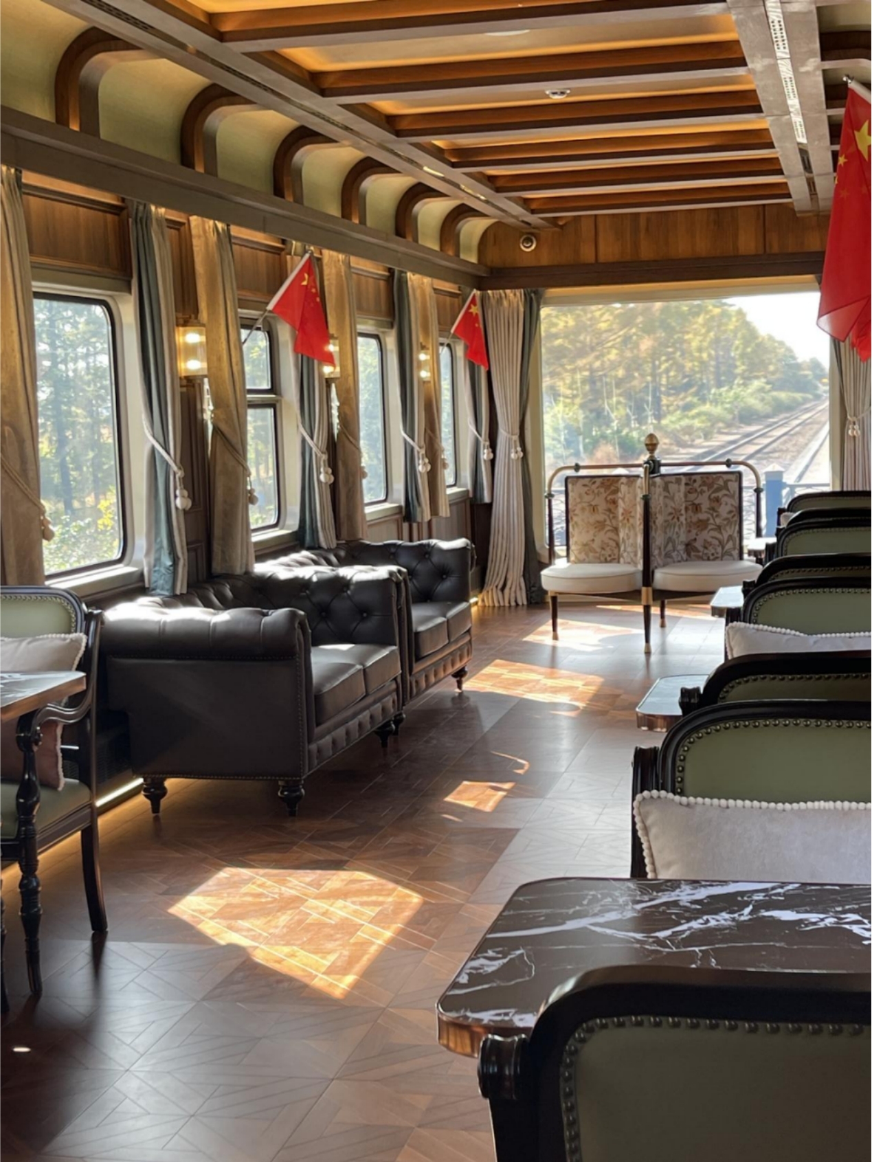 10月1日上午,哈爾濱站14站臺(tái)國(guó)旗飄揚(yáng)、花團(tuán)錦簇,在《伊人之春》、《我在黑龍江等你》等悅耳的音樂(lè)聲中,“伊春號(hào)”旅游列車首發(fā)儀式成功舉行,來(lái)自全國(guó)各地以及新加坡、泰國(guó)、臺(tái)灣等地的200余名中外游客齊聚冰城,開(kāi)啟了“游千里畫廊,賞最美五花山”浪漫之旅?!耙链禾?hào)”極具特色,外觀為輕奢復(fù)古風(fēng)格,車身主體顏色為深海藍(lán)和珍珠金,車頂?shù)陌咨怀鰜喍瑫?huì)冰雪主題,無(wú)論是行進(jìn)在“綠水青山”,還是“冰天雪地”間,都極具辨識(shí)度。列車整列編組11輛,最大亮點(diǎn)是其觀光車的設(shè)計(jì),其中有5輛休閑娛樂(lè)觀光車是根據(jù)“行走的敖麓古雅”“紅堡之夜”“金海岸漫步”“撒哈拉故事”“浪漫的溫哥華”五個(gè)大洲文化特色和建筑風(fēng)格設(shè)計(jì);有2輛多功能觀光車首創(chuàng)全景式觀光車廂和懷舊式旅拍車尾,視野極為開(kāi)闊,給游客們帶來(lái)全新的觀景體驗(yàn)。